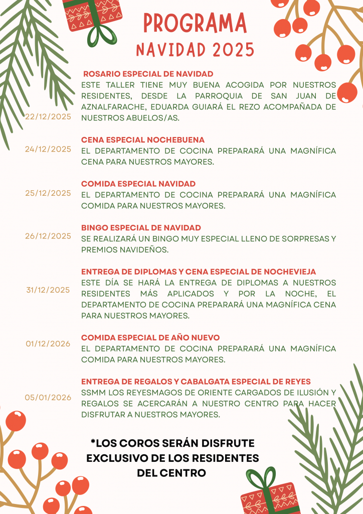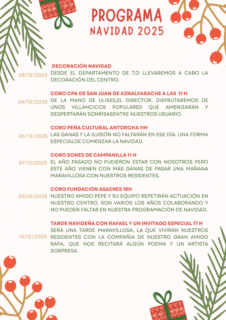 Nuestro centro ha preparado una amplia y emotiva programación navideña que se desarrollará entre hoy 3 de diciembre y el 5 de enero, diseñada para llenar estas semanas de música, tradición y momentos compartidos entre residentes, familias y personal.