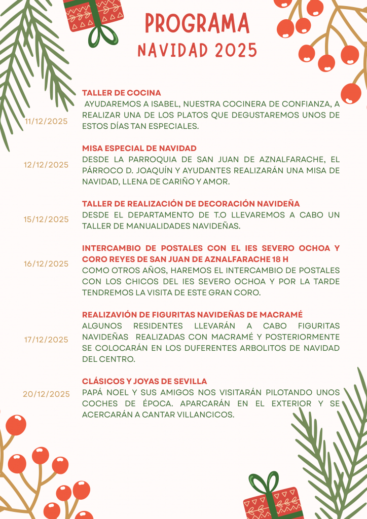 No faltarán citas especiales como la tarde navideña con Rafael y un artista invitado, el intercambio de postales con los jóvenes del IES Severo Ochoa o la visita de Papá Noel y sus amigos a bordo de coches clásicos. También habrá un taller de cocina junto a Isabel, la cocinera del centro, y celebraciones religiosas como la misa de Navidad y el rosario especial guiado desde la parroquia de San Juan de Aznalfarache.